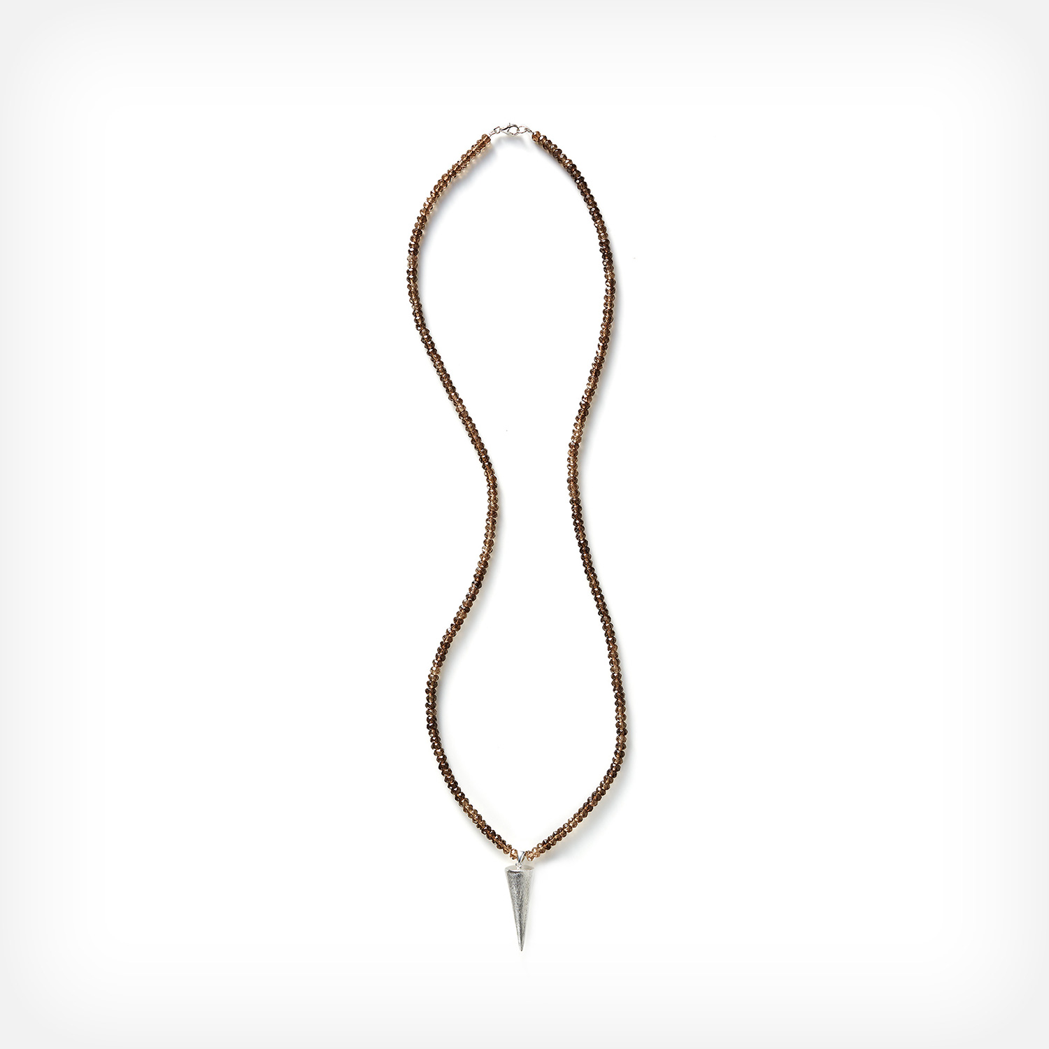 Long strand necklace with faceted Smokey Quartz stones and a handmade Sterling silver arrow pendant.